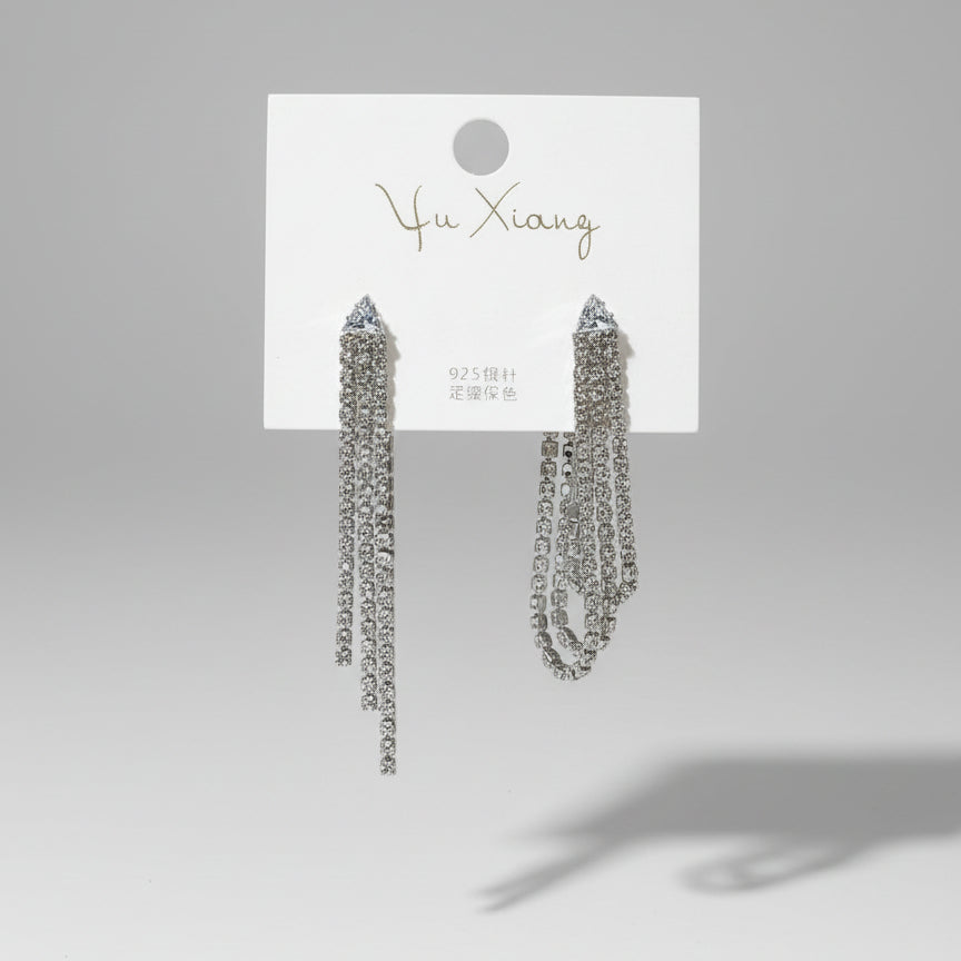 From the base of the triangle, multiple short, flexible strands of tightly set, sparkling rhinestone chains fall together to create a dense, shimmering fringe. The chains move fluidly, catching the light like a miniature waterfall. This style offers the drama of a drop earring without excessive length, keeping the focus right below the earlobe.